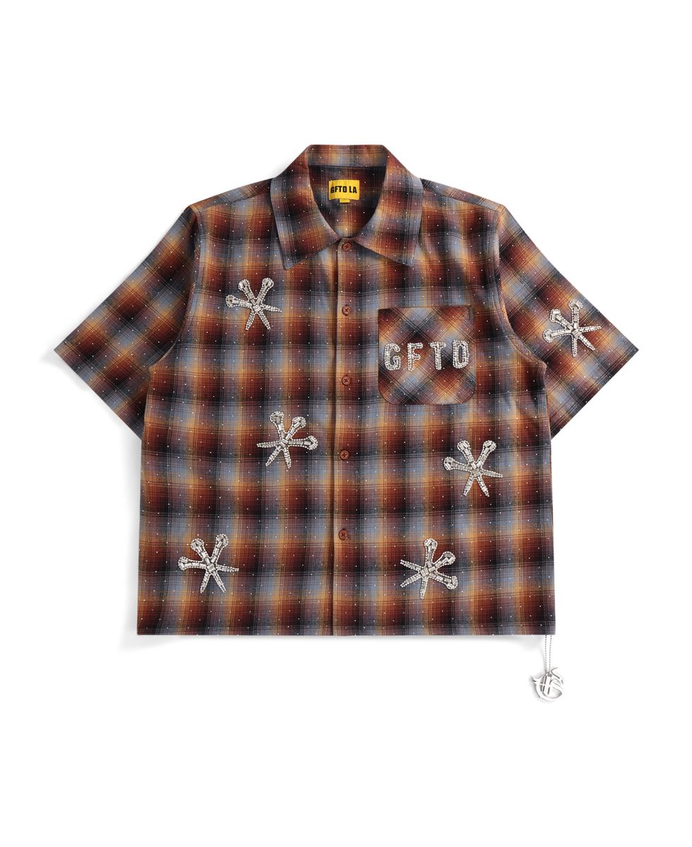 DAGGER PATCH WINE SHIRT-This striking collar shirt featuring an intricate dagger patch design adorned with bejeweled embellishments. Soft hints of red/blue and light orange are woven throughout, creating a sophisticated color palette that catches the light beautifully. The detailed beadwork adds texture and dimension, making this piece a standout addition to any wardrobe. Perfect for those who appreciate bold, artistic fashion with refined craftsmanship.