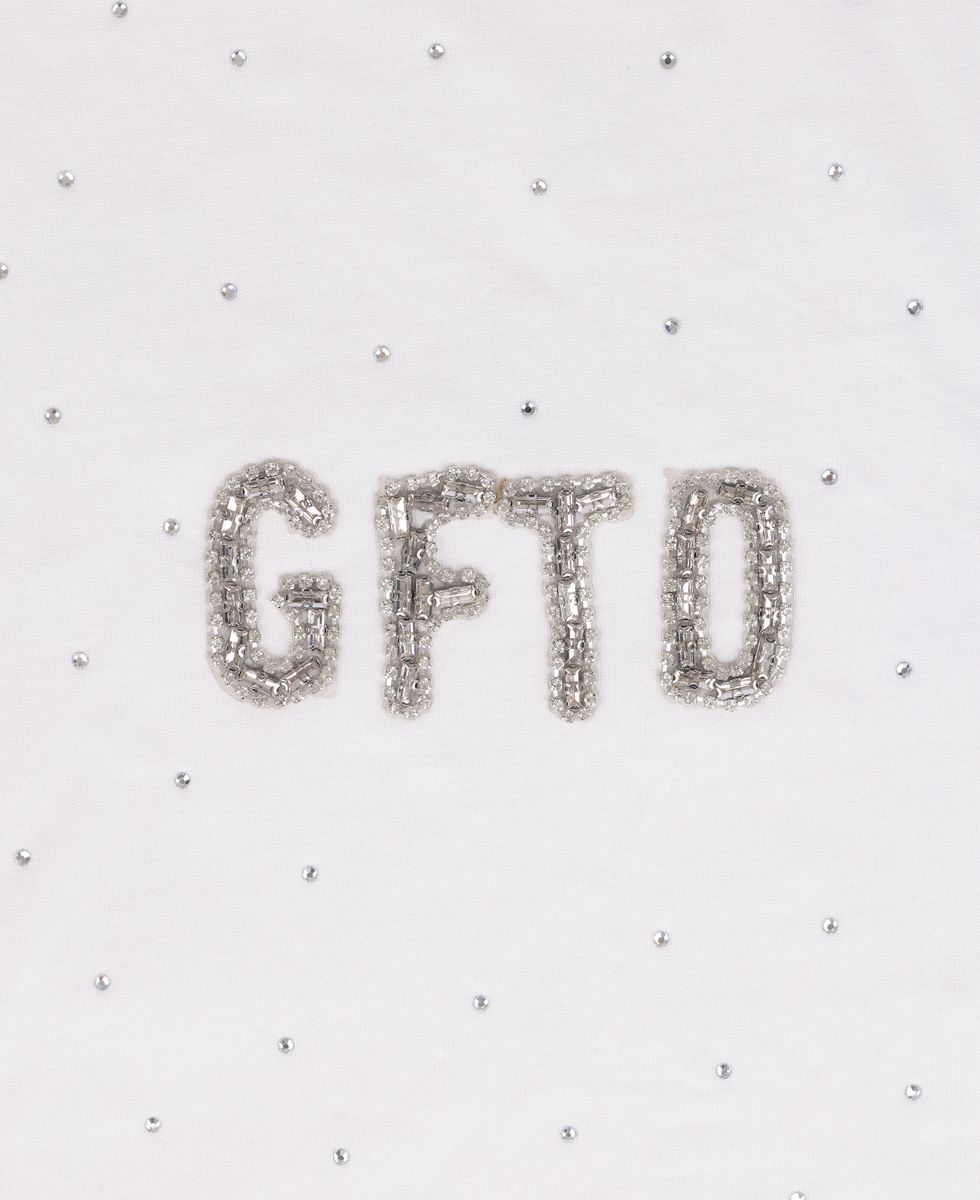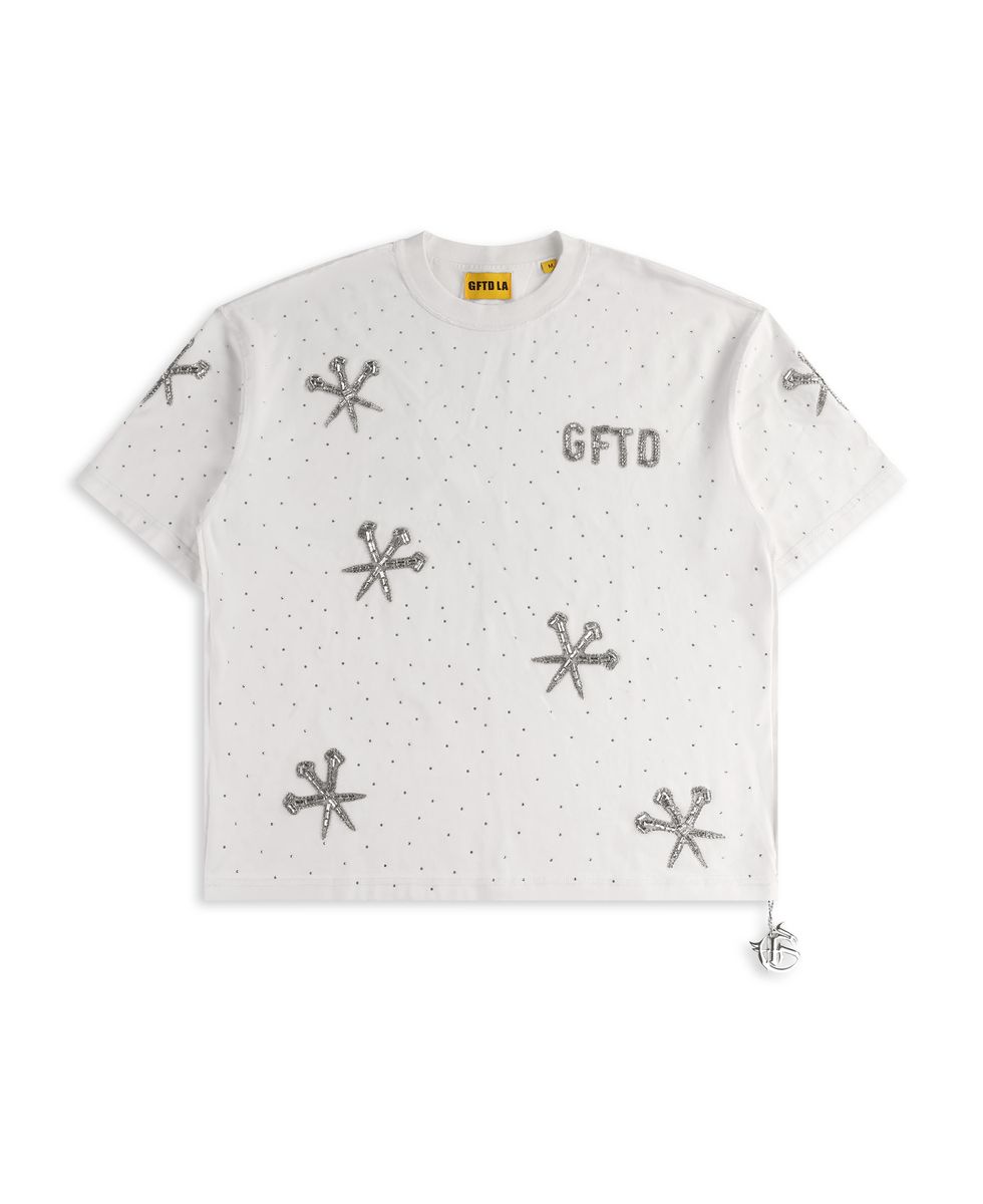 DAGGER PATCH WHITE TEE-Elevate your casual wardrobe with this striking white tee featuring an eye-catching dagger patch design. The jeweled embellishments add a touch of luxury,  transforming a simple t-shirt into a statement piece. Crafted for comfort without compromising on style.