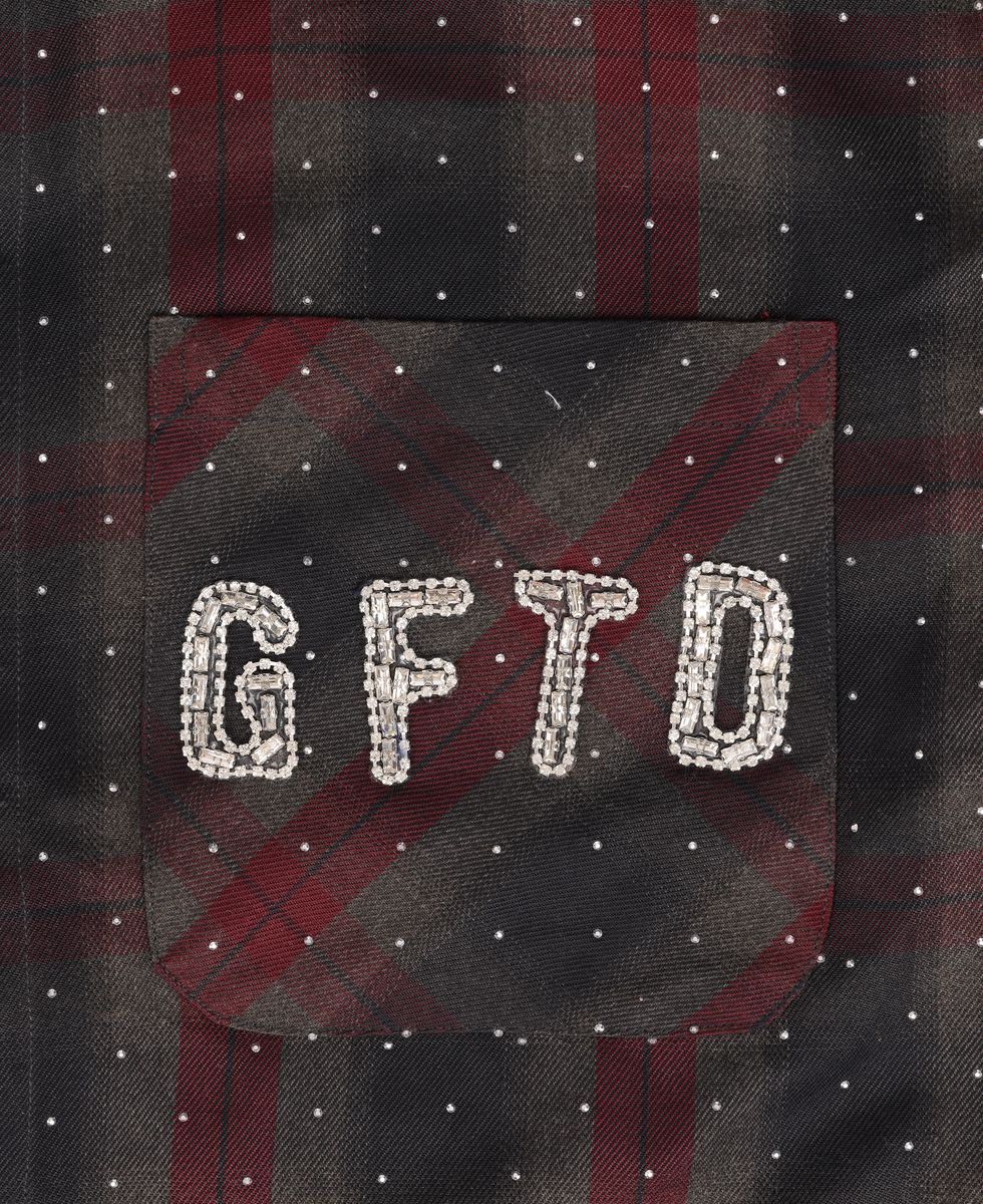 DAGGER PACTH BROWN SHIRT-This striking collar shirt featuring an intricate dagger patch design adorned with bejeweled embellishments. Soft hints of wine/brown are woven throughout, creating a sophisticated color palette that catches the light beautifully. The detailed beadwork adds texture and dimension, making this piece a standout addition to any wardrobe. Perfect for those who appreciate bold, artistic fashion with refined craftsmanship.