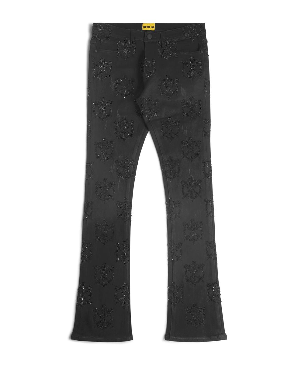 GFTD LA " LUX " stacked flare fit jeans ( Black wash ). 5 pocket 98% cotton with 2% spandex for high stretchability. Features Dagger logo rhinestone application throughout.. Fits true to size.
