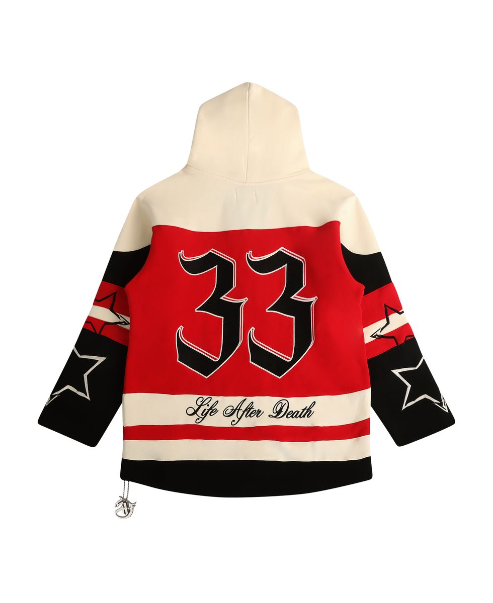 GFTD LA - Pathaway Red Hoodie - a striking box-cut design hoodie featuring long sleeves that features DTG printing that brings every detail to life. The powerful star design paired with "Life After Death" wording and the significant number 33. This isn't just a hoodie; it's a wearable declaration of your style. Free GFTD LA Metal key ring.