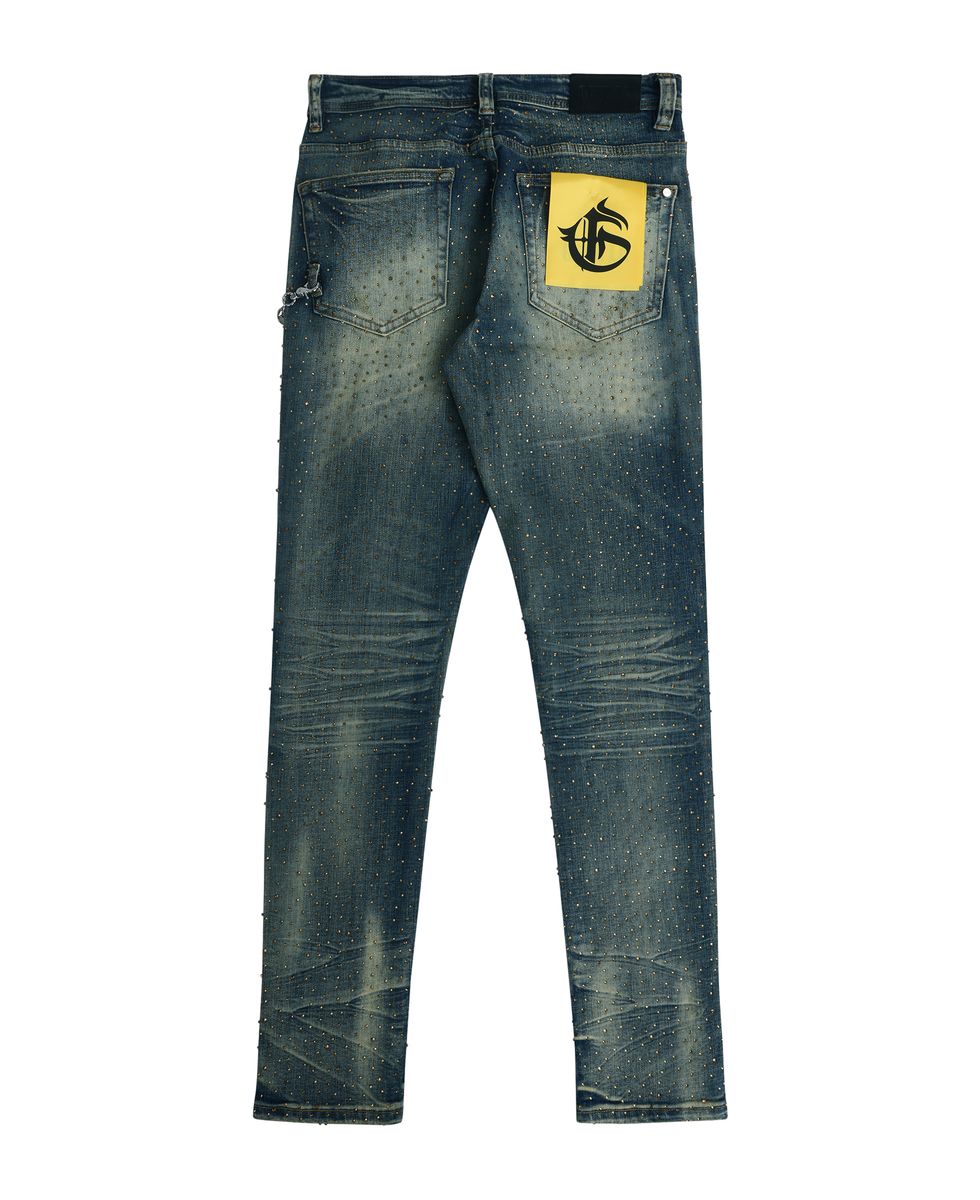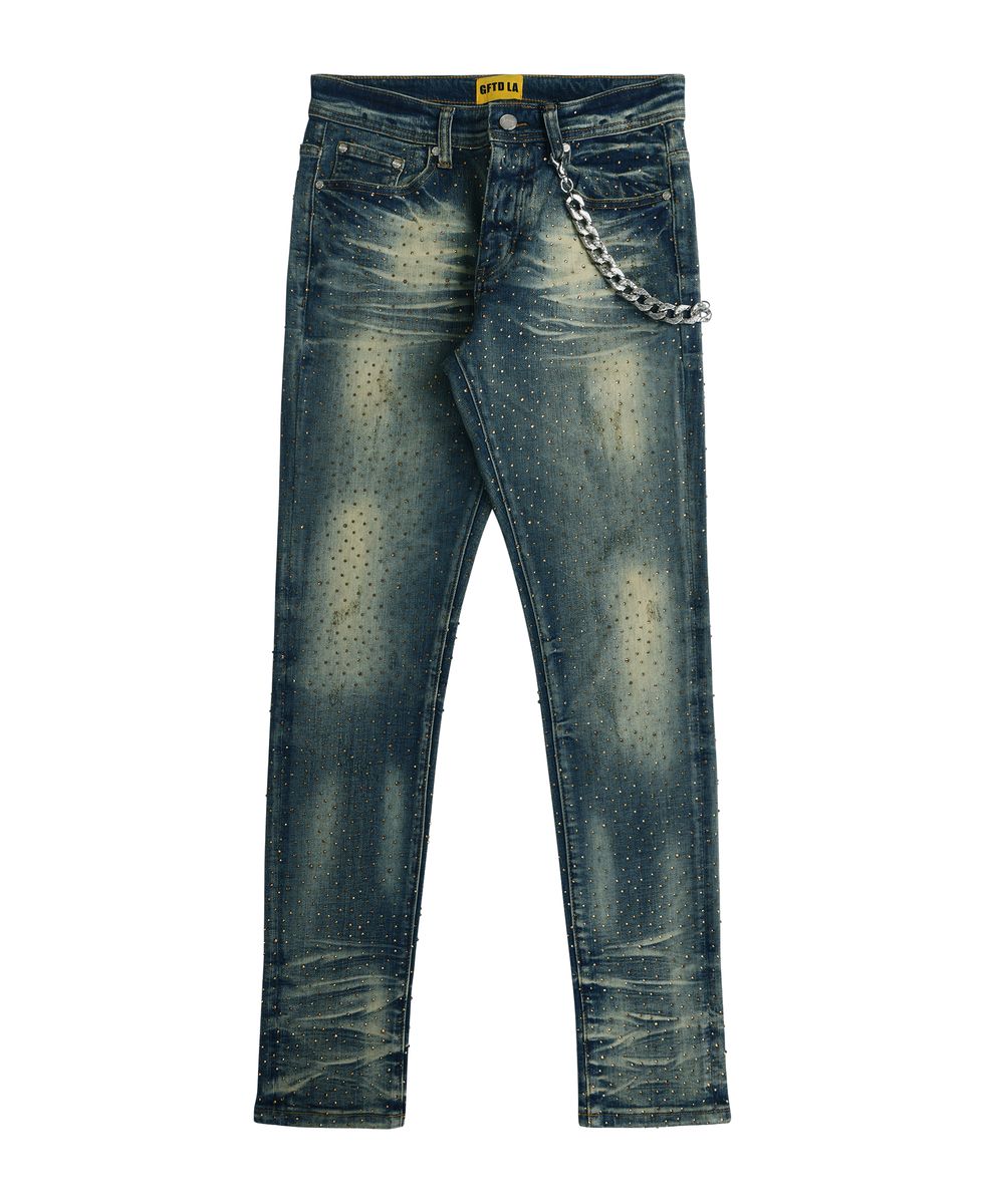 GFTD LA - AMI MD WASH SKINNY - the perfect blend of edgy sophistication and everyday cool. This skinny-fit style features an all-over embellishment of delicate stones that catch the light with every move, while a striking medal chain accent dangles from the pocket for that extra edge. Versatile enough for casual outings yet bold enough to make a statement, these pants are your go-to for turning heads without trying too hard.