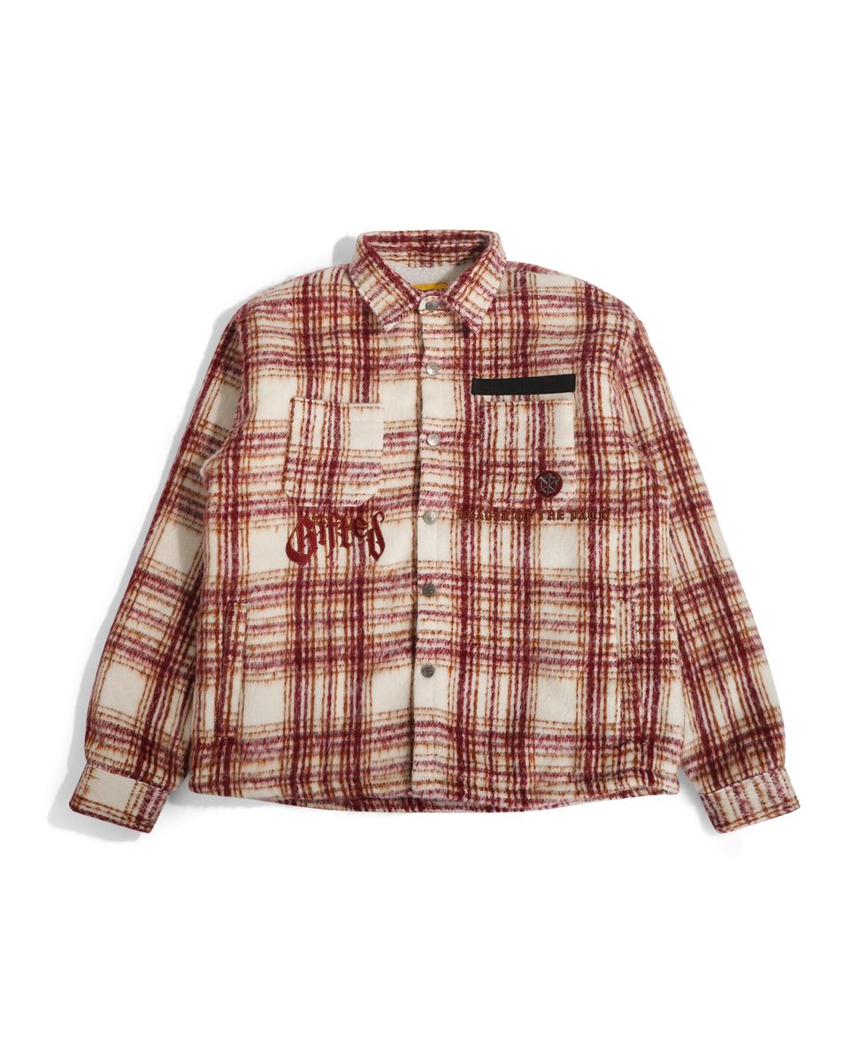 GFTD " LEADERS " Flannel Jacket. Double brushed flannel with sherpa lining. GFTD LA branded metal hardware. 3D embroidry design on backside. Fits true to size.