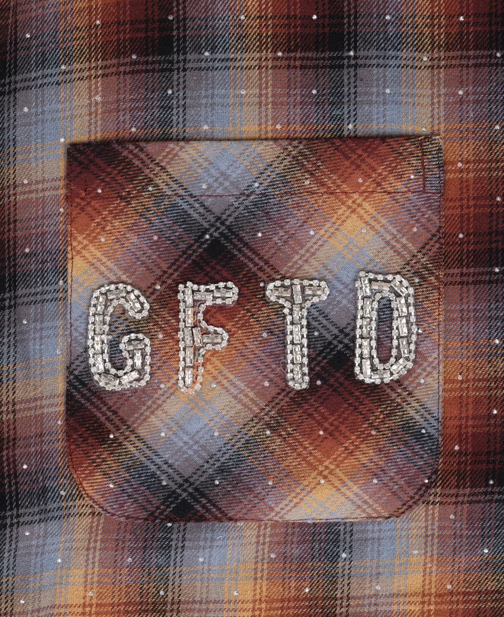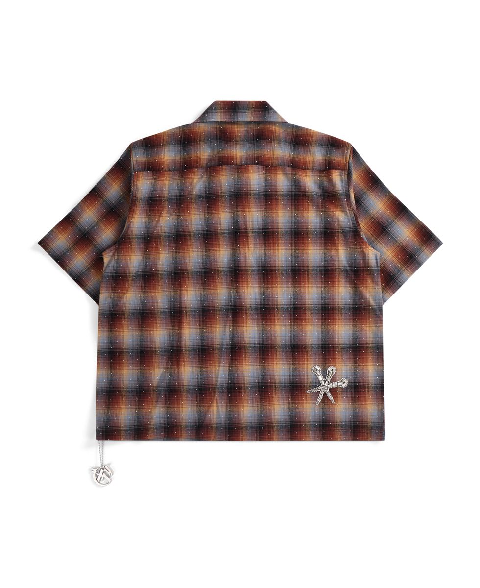 DAGGER PATCH WINE SHIRT-This striking collar shirt featuring an intricate dagger patch design adorned with bejeweled embellishments. Soft hints of red/blue and light orange are woven throughout, creating a sophisticated color palette that catches the light beautifully. The detailed beadwork adds texture and dimension, making this piece a standout addition to any wardrobe. Perfect for those who appreciate bold, artistic fashion with refined craftsmanship.